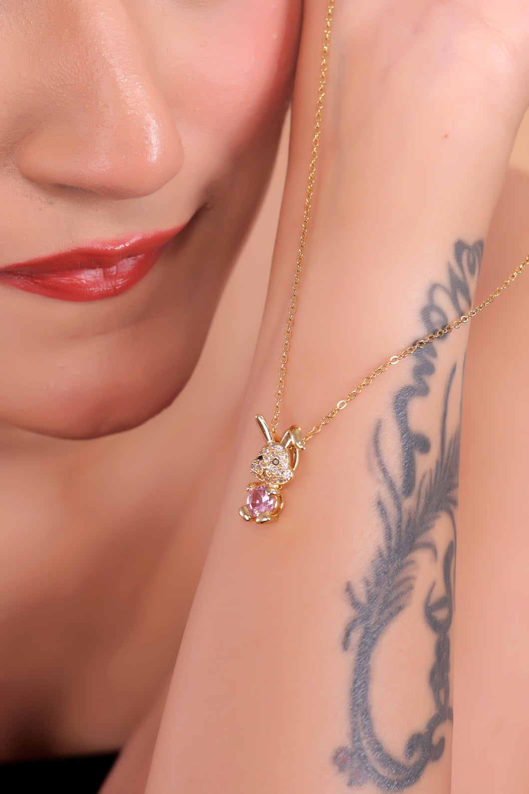 Indulge in the charm of this adorable gold bunny pendant necklace, designed to bring joy and elegance to your jewelry collection! Crafted with high-quality gold plating 🌟, this pendant features a cute bunny face adorned with dazzling white crystals 💎, giving it a playful and radiant sparkle. The highlight of this masterpiece is the large, round pink gemstone 🌸, symbolizing love, happiness, and good fortune.