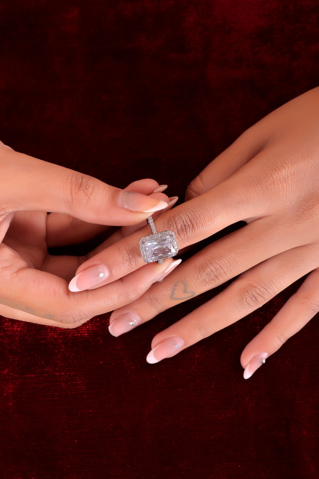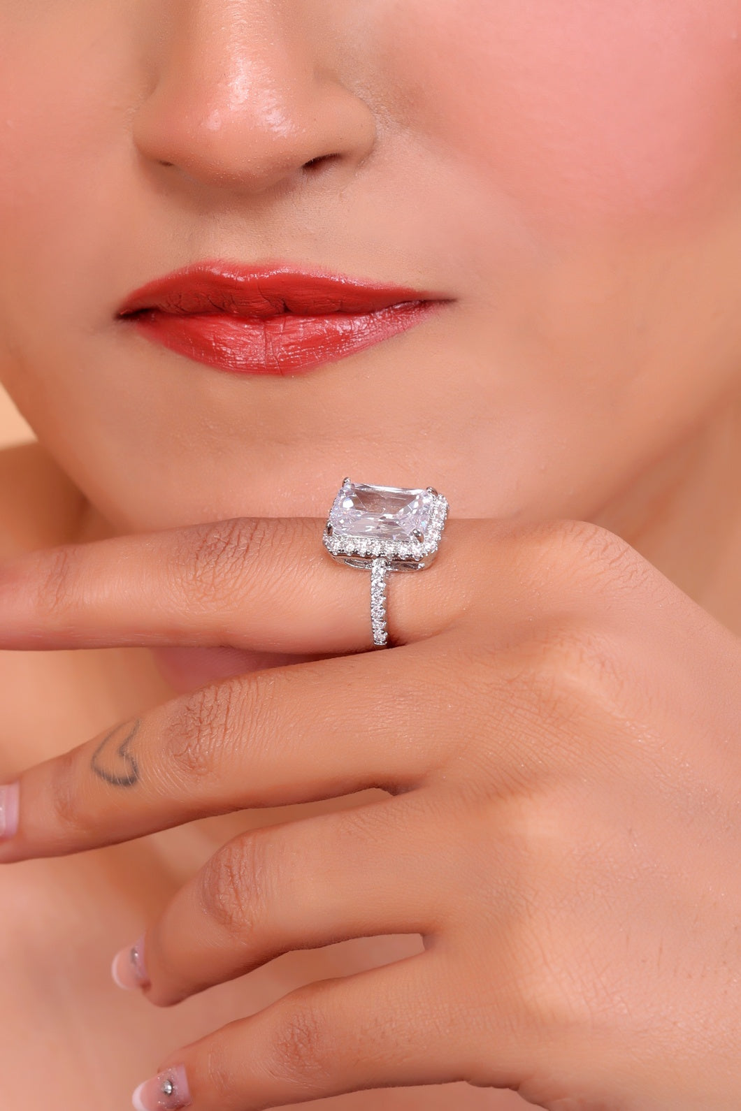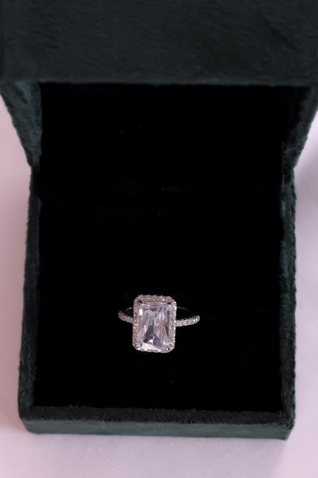 Crafted with meticulous attention to detail, the centerpiece of this ring features a cushion-cut clear gemstone, radiating a brilliance that will steal your breath away. Its soft, rounded corners and large surface area create a stunning visual effect that sparkles in the light, making it a true showstopper. The clear gemstone is of the highest quality, offering an unparalleled clarity that brings an air of refinement to any occasion. π