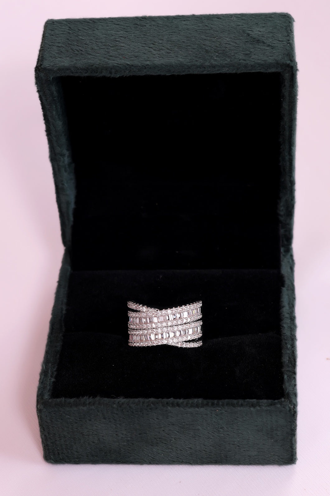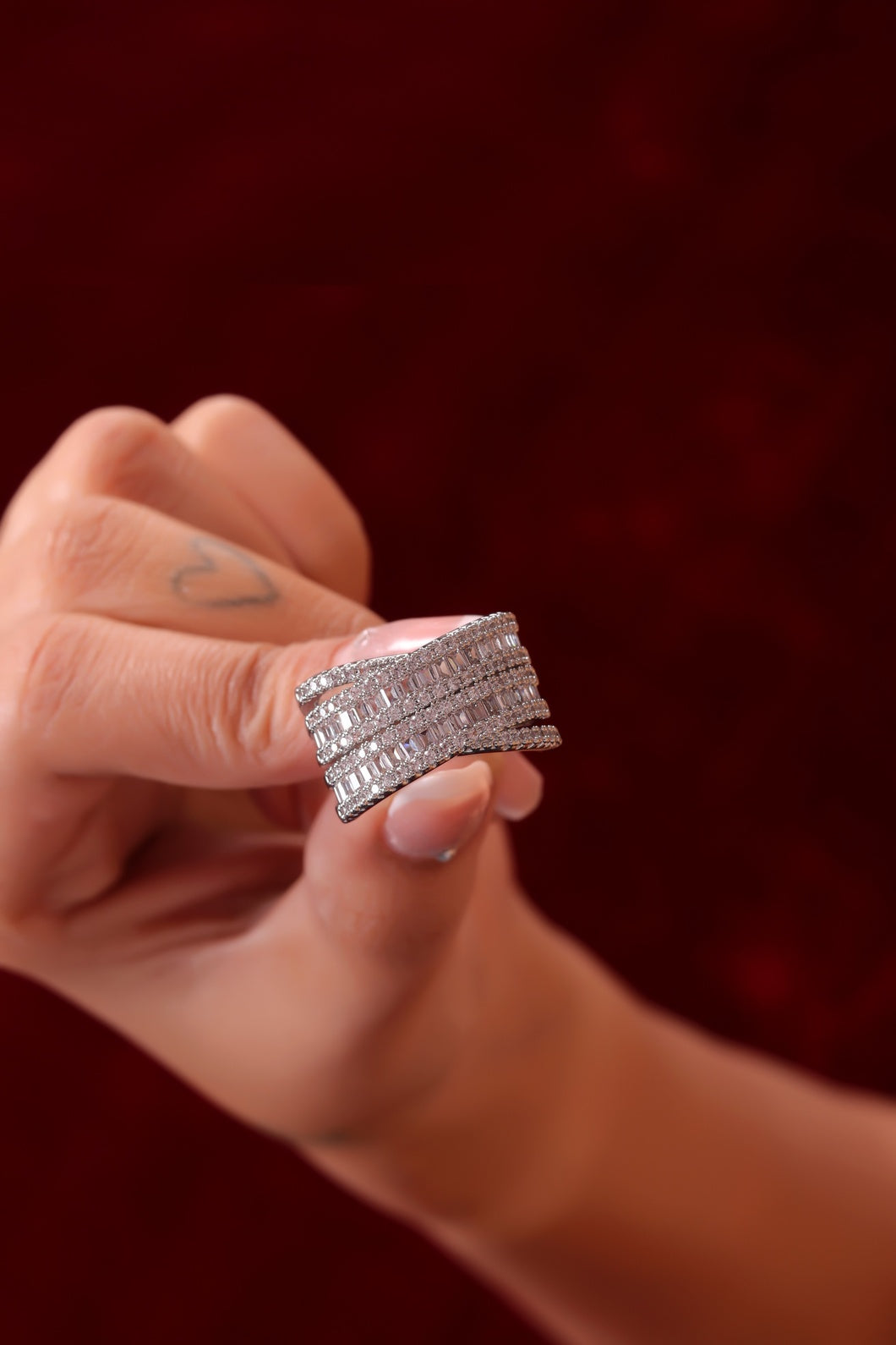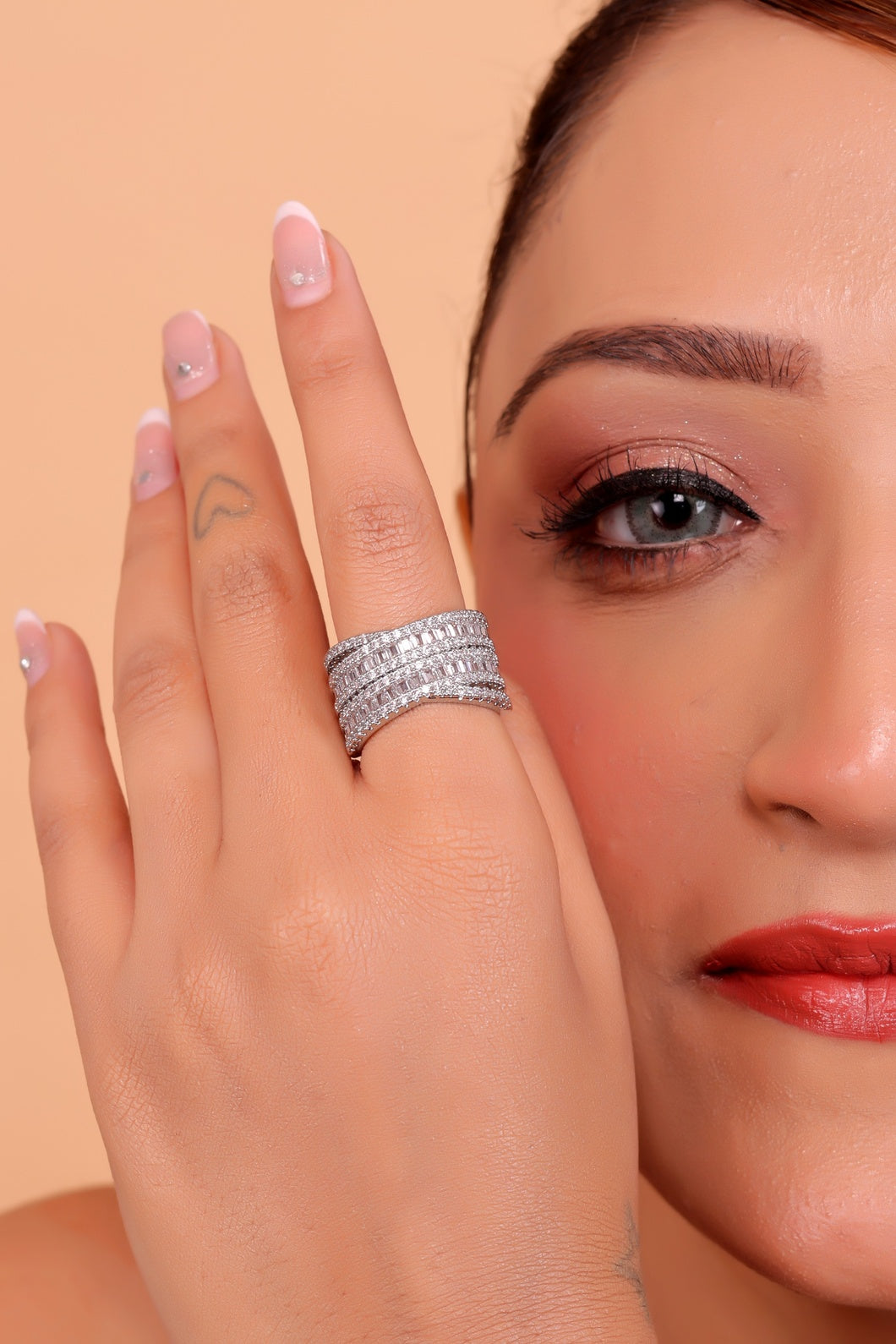 Make a bold and sophisticated statement with this stunning multi-layered silver ring π. Designed for those who appreciate elegance and brilliance, this exquisite ring features multiple intertwining bands, each adorned with radiant baguette-cut and round-cut gemstones that catch the light beautifully from every angle β¨. The intricate craftsmanship and dazzling shine make it a must-have accessory for any jewelry lover.